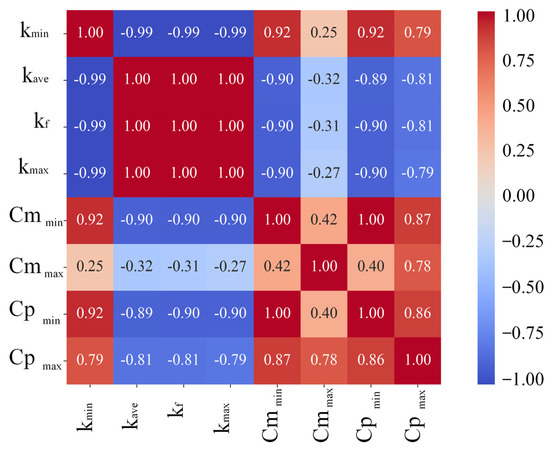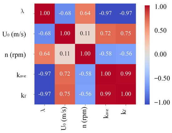 The variation of with is illustrated in Figure 7, and the correlation between each parameter is shown in Figure 8. Under constant rotational speed and varying incoming wind speed , when , the blade tip speed is opposite to the direction of , resulting in the minimum relative wind speed and the minimum value of :. Conversely, when , the blade tip speed aligns with the direction of , resulting in the maximum and the maximum value of k: . Under the same and different values of , , and , the fluctuations in increase with , while shows the opposite trend. According to Figure 8, the correlation between and is 0.72, whereas its correlation with is −0.58. This indicates that as increases or decreases, the incoming flow struggles to enter the wind rotor, leading to a more stable flow field inside the wind rotor and a corresponding decrease in .