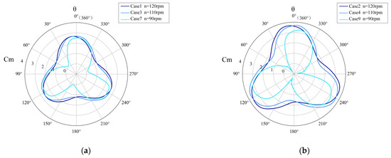 To investigate the influence of , the angle of attack () and the azimuth angle of the resultant velocity () can be maintained constant by keeping the incoming wind speed and tip speed ratio fixed. Different values of can be achieved by varying the rotational speed n. The settings for the case study, including the average value of ( and its fluctuation range within an operational cycle (, are detailed in Table 4. The wind speeds were set from the verified operating conditions in Table 3, and the rotational speeds were set based on the range of speeds common to H-VAWTs.