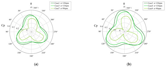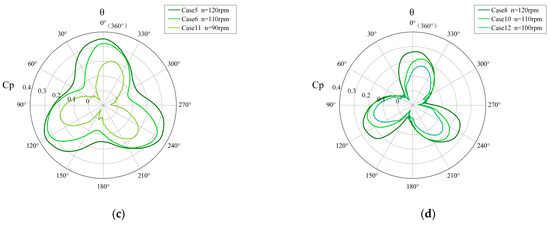 Figure 15 shows that at , the pressure around the blade changes with . There is no significant difference in pressure around the blades for all operating conditions. The pressure is higher at the leading and trailing edges of the airfoil, and the area of the low-pressure region is larger on the upper airfoil than on the lower airfoil. The airflow hits the leading edge of the blade directly, resulting in higher pressure in the leading edge area. At the same time, the airflow converges at the trailing edge after passing through the blade surface, forming a larger dynamic pressure region, so the pressure at the trailing edge is also higher. The response of the upper and lower airfoils to the airflow disturbance is more consistent, and the influence on the pressure distribution under different working conditions is small, resulting in insignificant differences in the pressure distribution.