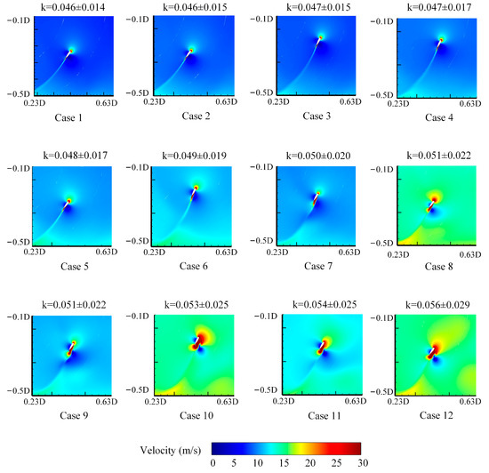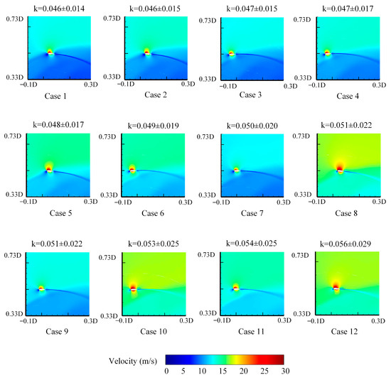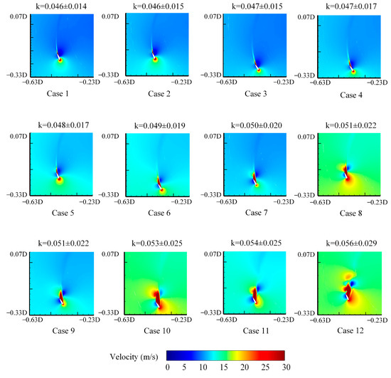 Figure 12 shows the variations in the flow field pattern around the blade with at the position of . It is observed that there is a high-speed area located at 1/10 of the chord length behind the trailing edge, but the velocity trajectory behind the trailing edge generally exhibits a velocity loss. When , the velocity loss trajectory of the blade’s trailing edge at is longer, and this trajectory intersects with the velocity loss trajectory of the wind rotor. Consequently, the flow field around the blade is significantly affected by the trailing edge velocity loss, and the velocity loss area on the lower surface of the blade extends beyond the airfoil range. As and increase, the velocity loss trajectory of the blade’s trailing edge at becomes shorter. The intersection point of the trailing edge velocity loss trajectory and the wind rotor’s trajectory moves back, eventually separating from the blade. When , the trailing edge velocity loss trajectory within the wind rotor intersects with the velocity loss trajectory at , thereby reducing its impact on the flow field around the blade. Therefore, the velocity loss area on the lower surface of the blade gradually shrinks to within the airfoil range.