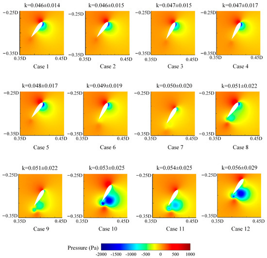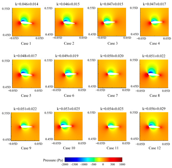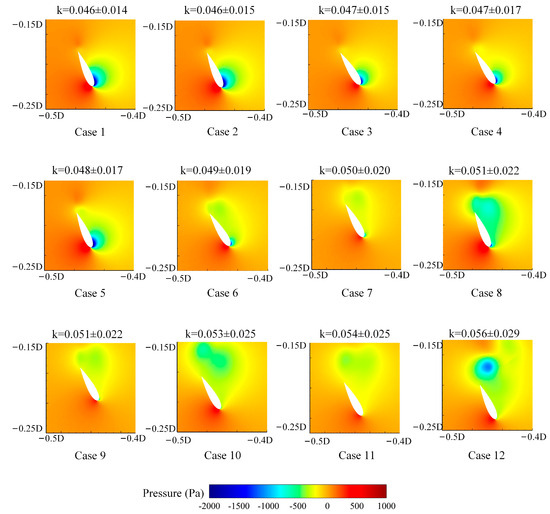 Figure 16 shows that at , the pressure around the blade changes with . As the H-VAWT rotates, the upper airfoil rotates to the windward side, where it is directly hit by the incoming flow, and the upper airfoil pressure is higher. The lower airfoil pressure becomes significantly smaller. As increases, the low-pressure region expands at the trailing edge. When , the low-pressure area at the trailing edge becomes larger, and low-pressure vortices are gradually developed. Under the influence of higher reduced frequency, the airflow cannot attach to the airfoil surface effectively, and the resulting separation vortex or vortex area becomes significant. These low-pressure vortices not only affect the pressure distribution of the blade, but also lead to additional aerodynamic drag and vibration.