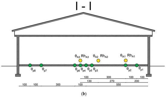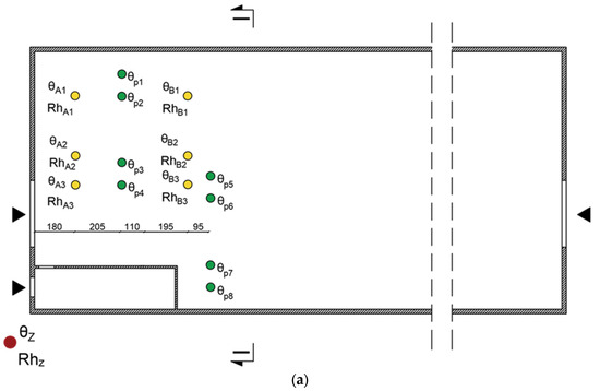 The surveys were carried out continuously, with a measurement frequency of every 15 min. Measurements were conducted at 14 measurement points (Figure 1). At the points marked θA1–θA3, θB1–θB3, the indoor air temperature of the building was measured. At points RhA1–RhA3, RhB1–RhB3 the relative humidity inside the building was measured, while at points θp1–θp8 the floor temperature was measured.