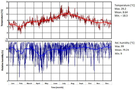 This study analysed the impact of the building’s location, material and construction floor solutions and the variation in terms of the heating device used on emissions of pollutants such as total dust, CO2, CO, NOx, SOx and benzo(a)pyrene. Three locations were adopted Jyväskylä (Finland), Graz (Austria) and Kassel (Germany). For this purpose, calculations were based on climate data available in WUFI®plus (version 3.5), for a typical meteorological year (TRY) at the selected locations. The basic climatic parameters that were included in the simulation, for each of the selected locations, are shown in Figure 2, Figure 3 and Figure 4.