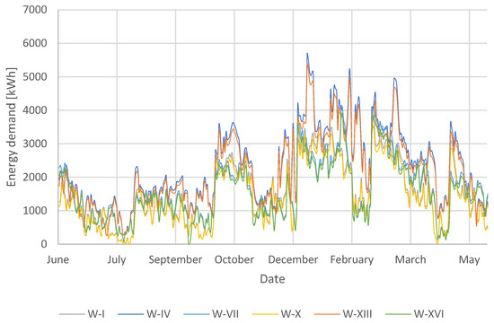 All of the locations analysed are in the northern hemisphere, so the period from November to April is characterised by lower outdoor air temperatures (winter half-year). On the other hand, May to October is characterised by higher outdoor air temperature values (summer half-year). As can be seen in Figure 6, the winter half-year is characterised by higher energy demands, in each of the locations analysed. The energy demand in the summer half-year is lower from 36% in Kassel to 45% in Graz compared to the winter half-year.