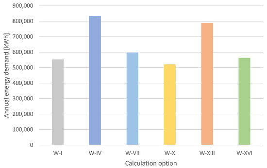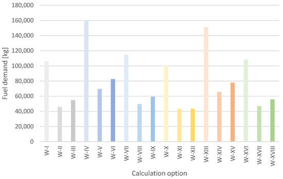 Annual fuel demand [B], for each of the calculation options analysed (I-XVIII).