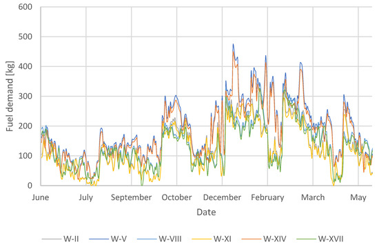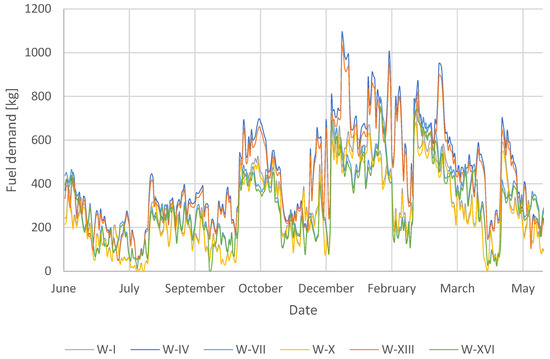 Based on the obtained results of the energy demand for heating, the fuel demand [B] was calculated for each of the analysed locations. Calculations were made using Formula (3). The results are shown in Figure 8, Figure 9, Figure 10 and Figure 11.