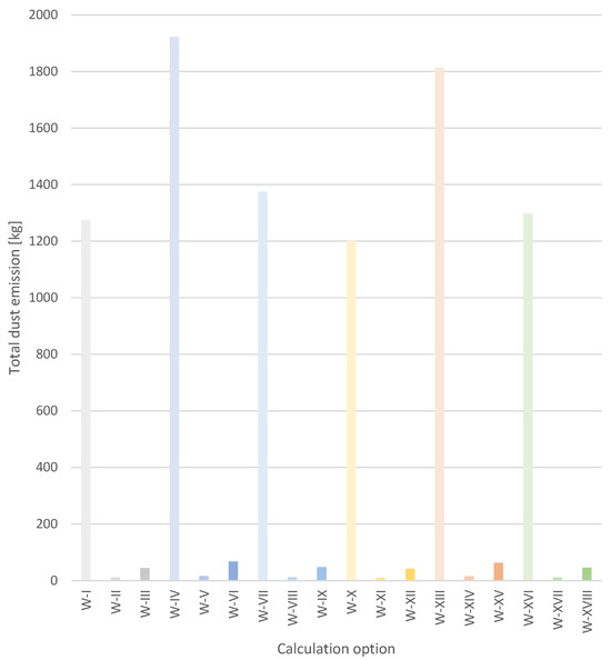 Total dust emissions from an individual building, for each calculation option analysed (I-XVIII).