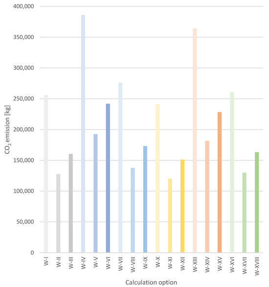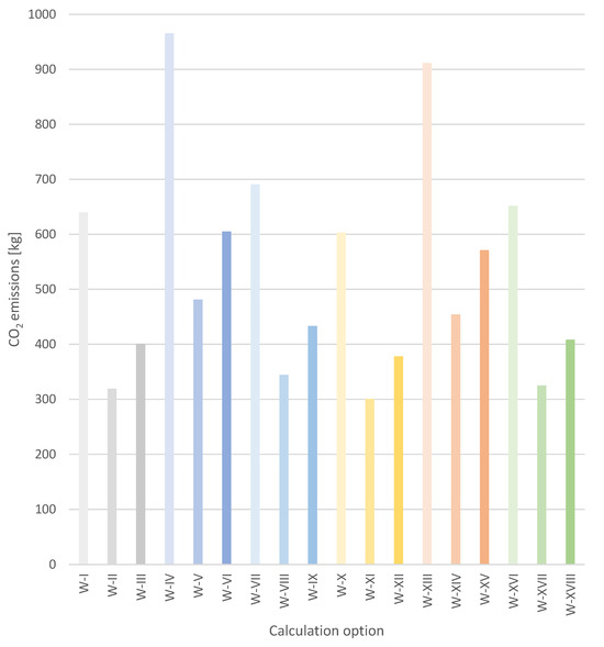 CO2 emissions per 1 LCU, for each calculation option analysed (I-XVIII).