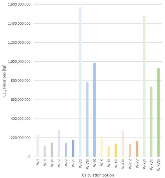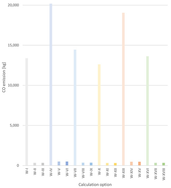 CO emissions from an individual building, in each of the calculation options analysed (I-XVIII).