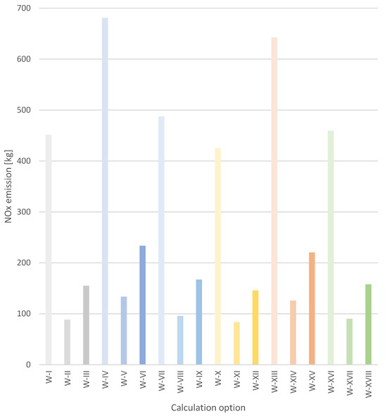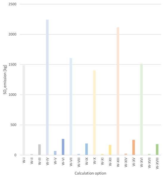 Analysing the SOx emission results, it can be seen that there are high emissions when using hard coal, compared to the other fuels analysed, in all calculation options. The highest emissions, as in the case of the previously discussed pollutants, were recorded in option W-IV and amounted to 2243 kg. The lowest values of SOx emissions were calculated for gaseous fuel and reach values 167 to 267 times lower compared to fuel oil and 1401 to 2243 times lower compared to hard coal.