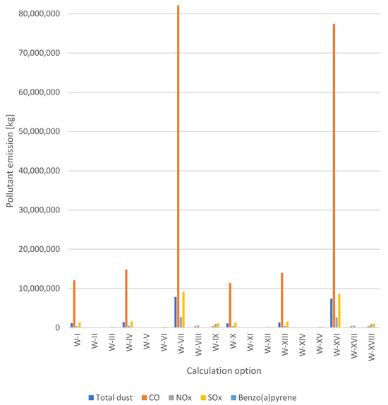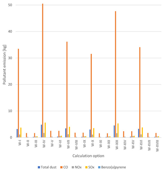 Emissions of pollutants (total dust, CO, NOx, SOx and Benzo(a)pyrene) per 1 LCU, for each calculation option analysed (I-XVIII).