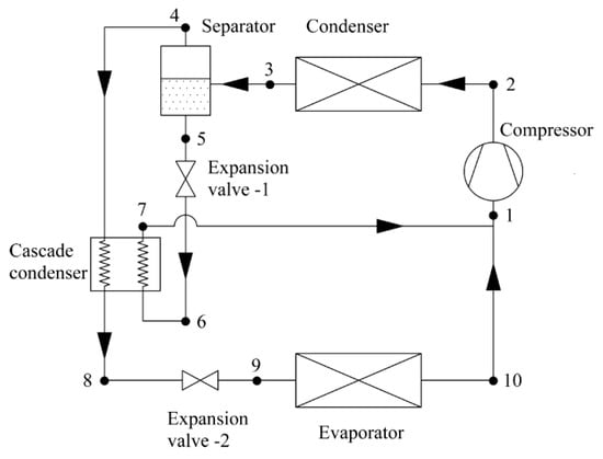 - Wang, Q.; Li, D.H.; Wang, J.P.; Sun, T.F.; Han, X.H.; Chen, G.M. Numerical investigations on the performance of a single-stage auto-cascade refrigerator operating with two vapor–liquid separators and environmentally benign binary refrigerants. Appl. Energy 2013, 112, 949–955. [Google Scholar] [CrossRef]