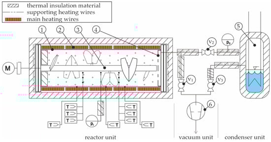 Pre-heating (−45 ≤ t ≤ −30): The reactor is preheated to a temperature of approximately 350 °C, while the condenser is simultaneously preheated to its initial temperature. The ploughshare mixing tool is rotating at a frequency of 250 rpm. During this phase, the condenser and reactor are connected to the environment (v1, v3 open, vacuum pump off), yet separated from each other (v2 closed). This configuration is maintained for approximately 15 min to ensure that the conditions remain in a steady state.