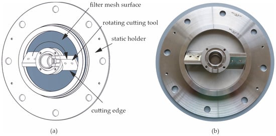 The reactor is connected to the condenser component via a heated steam hose. During the operational phase, the produced H2O(g) is driven in the direction of the condenser unit due to the naturally occurring pressure gradient. In order to separate the solid and gas phases, a filter unit is installed on the inner side of the front flange, as illustrated in Figure 1 ④. In a previous investigation, the presence of a filter cake material layer on the filter surface was observed, which resulted in a limitation of the mass flow and, consequently, the reactor power [17]. Accordingly, the filter construction has been modified with the objective of enhancing the mass flow through the filter surface, as illustrated in Figure 2. A static filter holder has been installed between the reactor flange and the reactor lid. The filtration process is achieved through the use of a clamped stainless-steel filter mesh, created through a twill weave with a geometric opening of 10 μm. In order to maintain the filter surface in a state free from deposits, a rotating cutting tool is connected to the rotating ploughshare and positioned in front of the filter surface, with the function of permanently removing deposits. The distance between the cutting tool and the filter surface is set in consideration of the expected thermal expansion of the material. The dimensions of the filter are as follows: inner radius: 36 mm, outer radius: 81,5 mm, resulting in a filtering surface of AF: 0.0168 m2. The impact of this new design is presented in the results section.