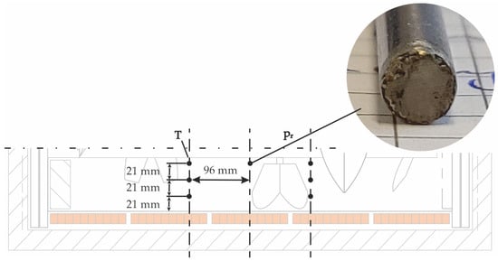 The temperature measurements are performed utilising Ø 0.5 mm type K class 1 thermocouples. Three-point type K thermocouples with a diameter of 4 mm are utilised for the determination of the bulk material temperature. The sensor positions are illustrated in Figure 3.