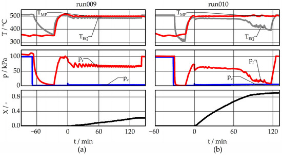 In contrast, the conversion in run009 is notably slower, reaching a maximum value of 0.22 within the same experimental time range. This leads to the assumption that in this case the mass flow through the filter is significantly restricted. In other words, the pressure difference available for mass transport through the piping and filter is thermodynamically defined, but the filter “consumes” it already for a comparatively smaller mass flow rate. At the end of the tests, the reactor is ventilated. In both cases, the ambient pressure is reached rapidly.