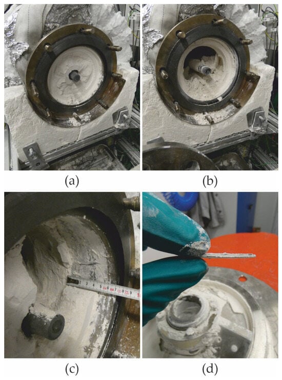 Following the completion of both tests, a layer thickness measurement of the filter deposits was conducted. The deposits formed in run009 exhibited a solid layer with a thickness corresponding to the distance between the filter surface and the first rotating ploughshare mixing blade, as illustrated in Figure 7a,c. However, the thickness was reduced to 3 mm by the installation of the cutting tool, as illustrated in Figure 7b,d. The thick filter deposits, which were identified and described in earlier studies by Risthaus et al. [17] resulted in the limitation of operational conditions.