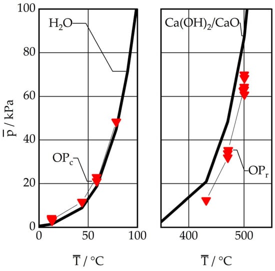 Figure 8 illustrates the equilibrium curve of H2O(l) ⇌ H2O(g) (water vapour pressure curve) and the reaction equilibrium curve of Ca(OH)2(s) ⇌ CaO(s) + H2O(g). These conditions are representative of those that can be expected in a pure water vapour atmosphere, as would be found in a condenser or reactor. The depicted points (OPc, OPr) present the experimental measured values. As can be observed, the measured values on the condenser side (H2O) are in close alignment with the theoretical values. The mean deviation of all tests is 2.62 ± 0.53 kPa, which may be attributed to the presence of residual air in the system or measurement inaccuracies. In contrast, the measured values on the reactor side (Ca(OH)2/CaO) indicate a pressure difference, with an average of −18.73 ± 4.44 kPa across all tests. This pressure difference represents a relevant parameter influencing the conversion ratio. However, the experimental data do not fully align with the kinetic equations, which was also observed by Risthaus et al. [17].