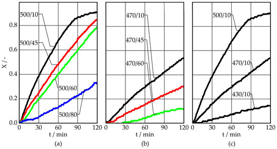 Figure 9 illustrates the measured conversion from t = 0 min to t = 120 min for each test. For purposes of an improved overview, the diagrams were grouped according to setpoint temperature. The left-hand diagram depicts the experiments conducted with a reactor setpoint temperature of 500 °C, while the middle diagram illustrates the experiments carried out with 470 °C setpoint temperatures. In both cases, the condenser setpoint temperature is varied, thereby influencing the pressure within the condenser section. The diagram on the right illustrates the experiments conducted with varying reactor setpoint temperatures of 430/470/500 °C, while the condenser setpoint temperature was maintained at 10 °C, resulting in approximately equivalent pressure conditions within the condenser unit. It is evident that a latent heat recovery would be feasible under all operating conditions. The conversion curve shows a relatively constant course in the majority of cases, which suggests a homogeneous reaction process. However, there is an exception to this, namely the 500/10 curve, where a decline in the conversion ratio can be observed after t > 70 min. This is due to the fact that the reaction is, under these conditions, already completed and the reactant in the form of Ca(OH)2 is no longer available in sufficient quantities from this point onwards.