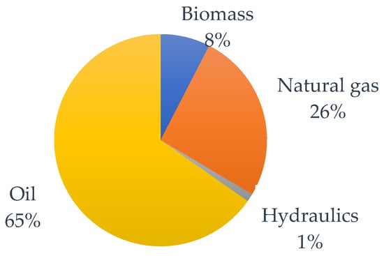 According to [8], in 2022, there were 165 isolated systems operating in the Northern, Northeastern, and Central–Western regions of Brazil. The distribution of these systems by state is shown in Figure 1. However, the percentage share of isolated systems in the total energy load for the Brazilian Electric System is slightly over 0.5%. Additionally, 2022 data report that the primary energy source for isolated systems was diesel oil, although there are also records of the use of natural gas and biomass, as illustrated in Figure 2.