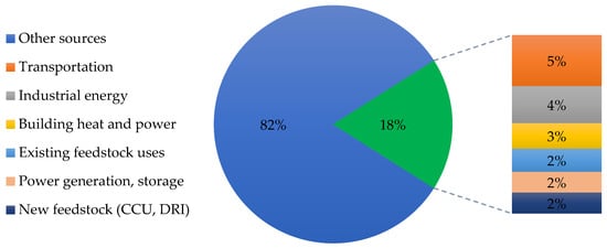 Hydrogen as a resource has had an established supply chain for decades, with various sectors using it as a raw material. However, projecting its use as an energy vector, according to the study presented in [18], it is estimated that by 2050 hydrogen could supply 18% of the world’s final energy demand. In this scenario, besides its current uses, hydrogen could additionally supply energy for the transportation sector (5%), industry (4%), heating and power generation in buildings (3%), energy generation and storage (2%), and new applications such as CCU (carbon capture and utilization) and DRI (direct reduced iron), as illustrated in Figure 4.