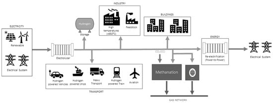 More specifically, green hydrogen (GH2) is obtained through the electrolysis of a water molecule, composed of two hydrogen atoms and one oxygen atom. Electrolysis separates hydrogen from oxygen in an energy-intensive process. In this alternative energy chain, one possible scenario is illustrated in Figure 5. Hydrogen has multiple potential functions, and one considered important, in the context of decarbonization, is enabling the use of renewable energy in sectors currently powered exclusively by fossil fuels [2].