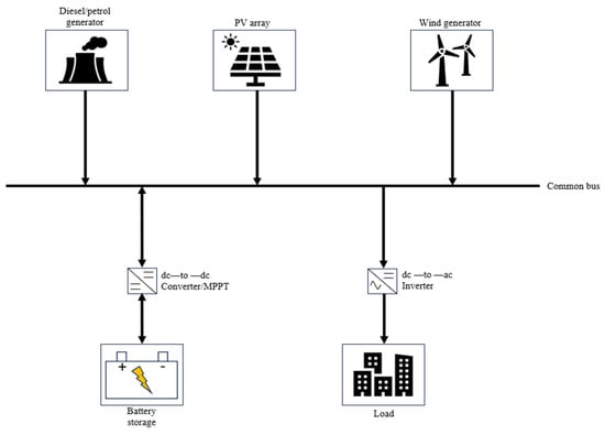 Globally and in Brazil, isolated systems are usually primarily supplied by diesel generation. However, depending on the geographical location, availability of natural resources, and energy source availability, other combinations can be made, such as energy storage, photovoltaic generation, or even wind generation, as illustrated in Figure 6.