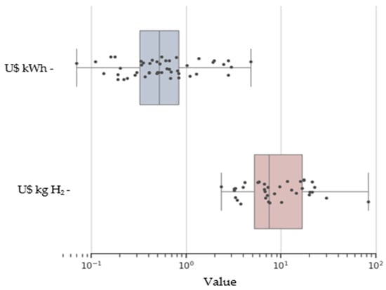Investigations into the factors influencing hydrogen production costs are described in [73,74,75,76,77,78,79], providing a comprehensive understanding of the costs associated with various technologies and production methods, from electrolysis to natural gas reforming processes. This detailed analysis not only allows the identification of areas for optimization and cost reduction but also contributes to more informed decision-making in the planning and implementation of hydrogen production infrastructure. By offering insights into the economic competitiveness of hydrogen compared to conventional energy sources, such studies play a fundamental role in driving sustainable development and influencing future energy policies.
