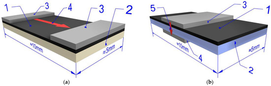 (a) View of nanocomposite sample on dielectric substrate [49]: 1—MX nanocomposite layer with a thickness of ≈1 µm, 2—dielectric substrate with a thickness of ≈0.4 mm, 3—silver paste contacts with a thickness of ≈0.1 mm, 4—direction of current flow; (b) view of nanocomposite layer on metallic or semiconductor substrate [48]: 1—nanocomposite layer with a thickness of ≈1 µm, 2—metallic or semiconductor substrate with a thickness of ≈0.4 mm, 3—top cladding of silver paste capacitor with a thickness of ≈0.1 mm, 4—contact of silver paste with a thickness of ≈0.1 mm to the bottom cladding, 5—direction of current flow.
