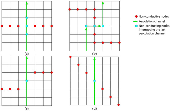 In the research presented, an inverted simulation logic was used for node percolation. The initial state of the matrix in this case is that all nodes are occupied with conductive elements. Then, non-conductive elements with diameters, equal to the diameter of the conductive disk, are randomly distributed in the matrix, replacing the conductive elements. After each draw, it is checked whether the drawn non-conductive element has a unit distance or distance √2 of another non-conductive element. This is because the interruption of the conductive channel in a square lattice matrix occurs both when neighboring non-conductive elements are distributed at unit distances and at distances √2 (Figure 2). When the percolation channel passes through non-conductive nodes arranged in vertical or horizontal directions, the node, interrupting the last percolation channel, can occupy three positions, as shown in Figure 2a,b.