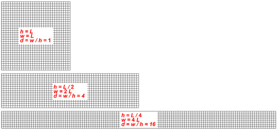 The first is a square-shaped matrix with dimensions h = w = L, which contains the number of nodes L2. The next matrix shown in Figure 3 has dimensions h = L/2, w = 2L and contains h × w = L/2 × 2L = L2 nodes, that is, as many as the previous square-shaped matrix as well. Another matrix shown in Figure 3 has dimensions h = L/4, w = 4L and contains L/4 × 4L = L2 nodes. The values of height h and length w of the matrices were chosen so that they were integers, and their quotients w/h were fairly evenly distributed on a logarithmic scale on the x-axis. The dimensions of the matrices used in the simulation and the quotients of their lengths to height d = w/h are given in Table 1.