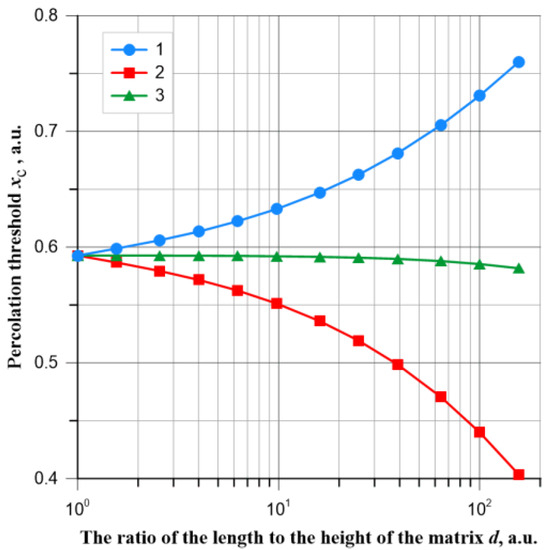 It can be seen from Table 2 that for a square-shaped matrix, the average values of the percolation thresholds in both directions of the current flow are practically the same. As mentioned above, the square-shaped matrix has a fourth axis of symmetry. Therefore, both directions of the current flow—between the top and bottom edges of the matrix and between the side edges—are equivalent. As is known, in square-shaped matrices, due to their high symmetry, there is no direction chosen. Lengthening of a rectangular matrix while reducing its height causes the average value of the percolation threshold to start increasing in the direction of a current flow along the matrix. In contrast, the percolation threshold in the transverse direction begins to decrease. This is due to a decrease in symmetry from 4 for a square-shaped matrix to 2 for rectangular matrices. In rectangular matrices, the direction selected appears, the parameters for which differ from those for the perpendicular direction.