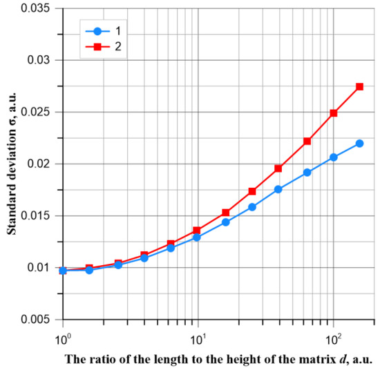 This can be clearly seen in Figure 4, where the dependence of both percolation threshold values on the quotient d of the length of the matrix to its height is shown. It can be seen from Figure 4 that the average values of the percolation thresholds with the elongation of the matrices change almost symmetrically with respect to the percolation threshold value of the square matrix. This is indicated by the average value of the percolation thresholds along and across the matrix, as shown in Figure 4 by line 3. The average value of the percolation threshold in the transverse direction of the rectangle decreases from a value of 0.592740 to 0.403614. In the direction along the matrix, it increases from 0.592665 to 0.759847. Based on the simulation results using Equation (3), the standard deviations for both directions of the current flow were determined, and their values are shown in Table 2. Figure 5 shows the dependence of the standard deviation values of the percolation thresholds for the current flow along and across the rectangular matrices. It can be seen from Figure 5 that both values of the standard deviations increase with the extension of the matrix. The standard deviation for the direction along the matrix increases from about 0.009732 to about 0.021989. The value for the current flow in the transverse direction of the matrix changes from about 0.009733 to about 0.027463.