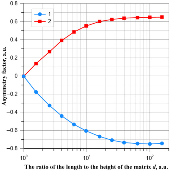 Dependence of the values of the coefficients A(x) of the asymmetry of the probability distributions (Equation (6)) from the quotient d of the length and width of the matrix for a matrix of square and rectangular shapes when current flows along—1 and across the matrix—2.