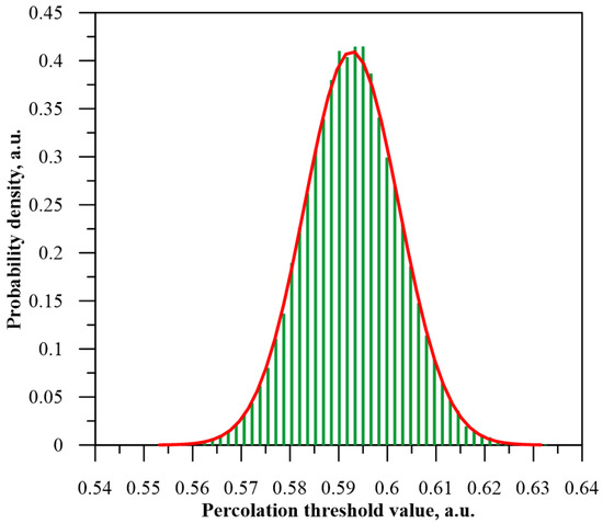 From the waveforms shown in Figure 6, for a square-shaped matrix (d = 1), the classical asymmetry coefficient is zero. This means that the probability distribution is symmetric. The histogram of the probability distribution for the square-shaped matrix (Figure 7), which was determined from the simulation results, was compared with the normal distribution, shown as a continuous line in Figure 7. As shown, the normal distribution perfectly describes the probability distribution of the percolation threshold values in the square-shaped matrix. This result is consistent with the results obtained in the thesis of [50]. This is also proven by the very close to unity value of the coefficient of determination R2 ≈ 0.99805.