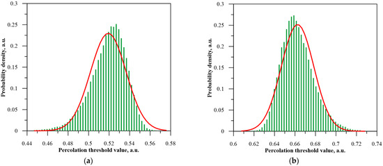 A comparison of the histograms and normal distributions (Figure 8) shows that the rectangular matrices have asymmetric probability distributions of the percolation thresholds. For the current flow in the transverse direction (Figure 8a), the position of the maximum shifts, compared to the normal distribution, into the area of higher values of percolation thresholds. The asymmetry of the waveform is negative, which means that the left slope is clearly wider than the right slope. In the case of the current flow along the matrix (Figure 8b), the opposite situation occurs. The position of the maximum moves into the region of smaller percolation threshold values. There is a positive asymmetry, for which the left slope is steep, and the right slope is stretched into the area of higher percolation threshold values. A comparison of the waveforms for a square-shaped matrix (Figure 7) and rectangular matrices with the same number of nodes (Figure 8) also shows that extending the matrix increases the maximum value of the distribution compared to a normal distribution. Similar histograms were obtained for the other rectangular matrices.