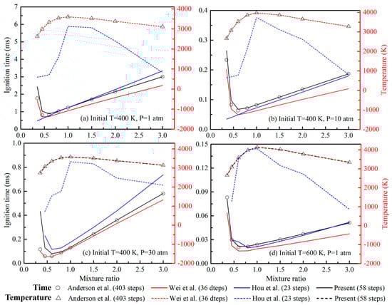 Figure 2 illustrates the changes in equilibrium temperature and ignition delay as a function of the mixture ratio, as predicted using different mechanisms. The mixture ratio, denoted as Mr, is defined as the molar ratio of N2O4 to MMH. Four sets of cases with varying initial pressures (ranging from 1 to 30 atm) and temperatures (from 400 to 600 K) are included. Whether under low or high pressures, the prediction made using the mechanism proposed by Hou et al. [7] exhibits significant discrepancies relative to the detailed mechanisms. These discrepancies become more pronounced as the mixture ratio varies. In contrast, the mechanism proposed by Wei et al. leads to equilibrium temperature predictions highly consistent with those based on the detailed mechanisms. However, it exhibits notable discrepancies in ignition time, particularly at larger mixture ratios. Furthermore, the mechanism proposed by Wei et al. [12] shows larger errors at lower mixture ratios, as depicted in Figure 3.