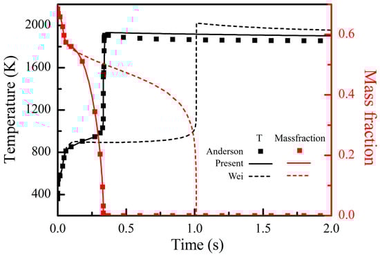 Table 1 shows a comparison between the proposed reaction mechanism and the existing chemical kinetic models, including the detailed mechanisms proposed by Catoire et al. [4] and Anderson et al. [5], as well as the reduced mechanisms presented by Hou et al. [7] and Wei et al. [12]. To validate the reaction mechanisms, a series of MMH/N2O4 ignition simulations in a zero-dimensional closed homogeneous reactor were performed using Chemkin-Pro software (version 2022 R2). Figure 1 shows the results that demonstrate the instantaneous temperature changes under different mechanisms. Two distinct cases were analyzed, of which one involved a mixture of MMH/N2O4/NO2 at T = 298 K and P = 0.242 bar, while the other involved MMH/NO2 at T = 1000 K and P = 1 bar. The temperature changes predicted through the mechanisms proposed by Catoire et al. [4] and Anderson et al. [5] are highly consistent, indicating the reliability of these detailed mechanisms. In the absence of experimental data, the results obtained from these detailed mechanisms provide a reference for this paper. Through comparison, it is revealed that the reduced mechanism proposed by Hou et al. [7] shows a significant discrepancy, with a delayed prediction of the combustion process and an underestimation of the equilibrium temperature. The equilibrium temperatures predicted using the mechanism proposed by Wei et al. [12] are basically consistent with the reference values, despite some differences in temporal changes. Overall, the results obtained from the proposed reaction mechanism are consistent with those obtained from the detailed mechanisms, demonstrating a higher accuracy compared to the existing reduced mechanisms.