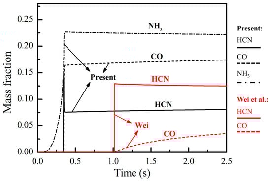Figure 3 presents the results of ignition obtained for an MMH/N2O4 mixture at T = 400 K, P = 30 bar, and Mr = 0.15. The combustion process predicted using the mechanism proposed by Wei et al. [12] exhibits a noticeable delay, as evidenced by the variations in temperature and MMH concentration. In such fuel-rich conditions, the reaction pathways from MMH to CO play a significant role, which results in the substantial production of CO and NH3, as illustrated in Figure 4. For the fuel-rich case depicted in Figure 3, the pathways related to HCN contribute to over 90% of CO production at the peak CO production rate. However, the mechanism proposed by Wei et al. [12] excludes these pathways, with only the conversion of MMH to HCN retained. Therefore, as shown in Figure 5, the mechanism proposed by Wei et al. [12] is used to predict a significant accumulation of HCN with minimal CO production, which results in a significant delay to the combustion process.