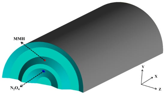 To simplify the computational model, only half of the combustor was included in the computational domain, with the impinging injectors positioned in the mid-plane, as depicted in Figure 6. The nozzles for MMH and N2O4, whose diameters were 0.48 mm and 0.39 mm, respectively, were used to produce jets at the injection angles of 15 and 20 degrees. The mass flux ratio of the two jets was set to 1:1.65. The computational domain was first discretized using a non-uniform grid consisting of 3.5 million hexahedral cells. Then, an automated adaptive refinement method was applied to capture the phase interfaces. Mesh refinement was controlled by the gradients in the liquid phase volume fraction, with constraints imposed on the smallest cell size (10−18 m3) and a maximum refinement level of 6. After the spray reached a steady state, the final mesh that contained over 11 million cells was obtained.