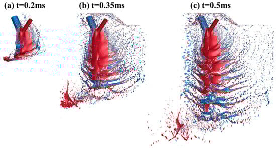 Figure 7 illustrates the evolution of the spray generated by the impinging jets of MMH and N2O4, as described by the iso-surface of the liquid-phase volume fraction. Initially, a fan-shaped liquid sheet develops at the point of impingement and expands downstream. With the development of unsteady waves induced by hydrodynamic instability and the interactions between the gas and liquid phases, the liquid sheet decomposes progressively into arc-shaped ligaments, large clumps, and, ultimately, finer droplets. This model is effective at capturing both the primary and secondary processes of atomization. When the spray reached a steady state by 0.5 ms, it was characterized by the periodic and consistent shedding of liquid ligaments. The steady-state spray distribution is further illustrated in Figure 8. Notably, the radial momentum is not fully neutralized due to the larger nozzle diameter and higher mass flux of the N2O4 jet compared to the MMH jet. This results in the liquid sheet moving slightly upwards, which is particularly evident in the side regions. Thus, arc-shaped distribution is exhibited in the y–z cross-section. The MMH jet remains more concentrated in the central region of the fan-shaped liquid sheet, with a smaller spray angle and larger breakup length compared to the N2O4 jet.