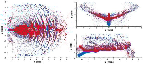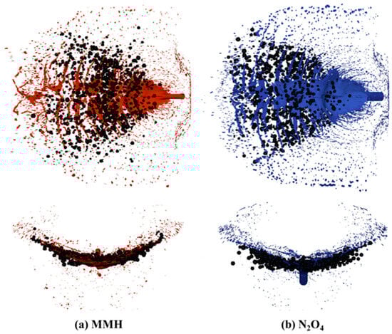 In the subsequent simulation of spray combustion, the Euler–Lagrange method was used. Within this framework, the continuous liquid sheet was represented by discrete droplets, with their initial distributions determined using the flat-fan injection model [35]. This model requires the use of various parameters, such as the impinging point position, spray half-angle, normal vector, and orifice width. In this study, a statistical analysis of the calculated spray distributions was conducted to determine the key characteristics, such as the spatial location, spray angle, breakup length, and droplet diameter. Then, these characteristics were analyzed to improve the initial droplet settings in the flat-fan model. Figure 9 shows the discrete droplets generated by the flat-fan model in conjunction with the original liquid sheet distributions. The droplet diameters range from 15 to 125 , conforming to the Rosin–Rammler size distribution, as determined by the spray characteristics. For better visualization, the droplets in the figure are enlarged, with some droplets omitted. According to the results of the comparative analysis, the discrete droplets accurately reflect the overall distribution of the liquid sheet formed by the impinging jets, making them suitable for use as initial propellant distributions in the subsequent simulations of spray combustion.
