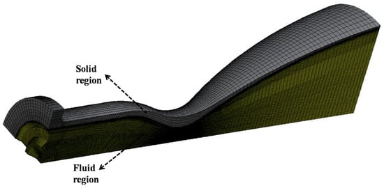 The conductive heat transfer within the solid region was analyzed by solving the thermal transport equation. It is presented as Equation (11) below.