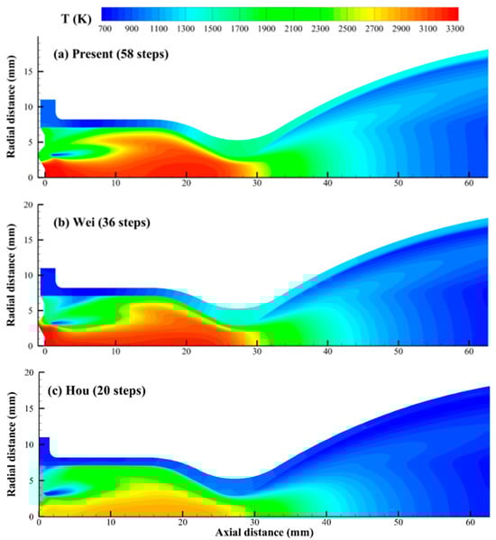 Figure 12 shows the comparisons of temperature distributions calculated using the three mechanisms. The presence of low-temperature regions is predominantly observed around the impingement points of the injected propellants, where intense mixing and vaporization occur. As the propellants move downstream, the temperature increases dramatically due to combustion reactions, with the chamber filled by high-temperature gas products. As shown in Figure 12, the temperature distribution predicted using the mechanism proposed by Hou et al. [7] differs significantly from those predicted by Wei et al. [12] and in the present study. The maximum flame temperature calculated by the mechanism of Hou et al. [7] is significantly underestimated, with their predicted value being approximately 2600 K. This error is primarily due to the incomplete combustion caused by oversimplified reaction routes.