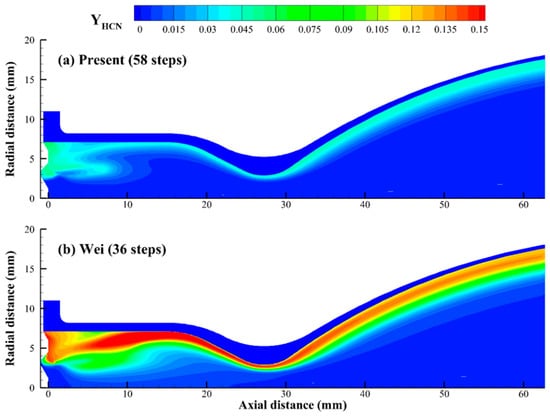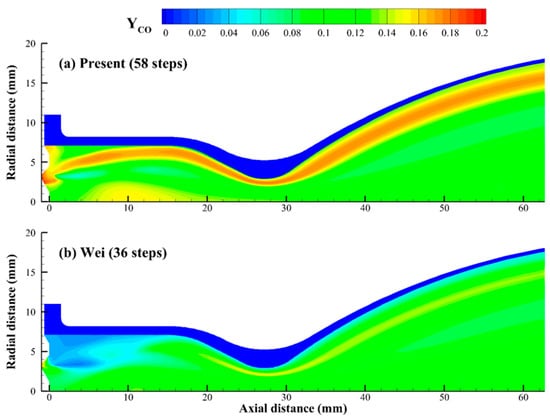 In contrast, the temperature distributions predicted by Wei et al. [12] and the present mechanism are more comparable. The main difference lies in the temperature changes at the corner of the injection plane and the side wall. As shown in Figure 12, the mechanism proposed by Wei et al. [12] is used to predict a lower temperature at this corner compared to the present mechanism. In this area, the liquid MMH partially impacts the side wall, while the remainder spreads to form a liquid film around the inner chamber wall, which gives rise to a fuel-rich region. The discrepancies in the prediction of Wei et al. [12] can be attributed to their simplified reaction pathways from MMH to CO. Because their model fails to accurately represent CO production under fuel-rich conditions, excess HCN accumulates, as depicted in Figure 13 and Figure 14. These observations are consistent with the zero-dimensional reactor calculations described in Section 2. Consequently, the wall temperature is underestimated, as detailed in Table 2, largely due to the incomplete combustion of MMH. The proposed mechanism, however, is accurate in capturing the conversion of HCN to CO in the fuel-rich region, which improves the accuracy of wall temperature prediction.