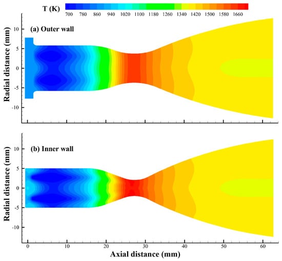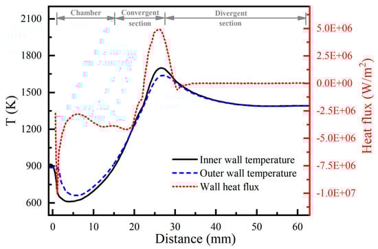 Figure 17 shows the axial variations in wall temperature and heat flux. Due to the presence of liquid film, a negative heat flux develops on the front side of the chamber wall, with the initial inner wall temperature being lower than that of the outer wall. As the axial distance increases, the protective effect of the liquid film diminishes gradually, resulting in a rise in the inner wall temperature. Near the convergent section, the liquid film disappears, causing a rapid increase in the wall heat flux. Due to the significant decrease in gas temperature and pressure in the divergent region, the wall heat flux and temperature are observed to peak around the throat. It is indicated that the liquid film acting as a thermal barrier reduces the convective heat transfer from the high-temperature gas to the inner chamber wall, which indirectly mitigates the temperature rise in the throat area. Therefore, the reasonable design of the impinging cooling jets is crucial for the high performance of the engine.