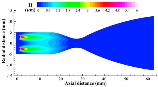 As shown in Figure 12, the liquid film forms a thin, low-temperature layer around the inner wall, resulting in a sharp radial temperature gradient. Protected by the liquid film and its vaporized gas, the chamber wall maintains a significantly lower temperature than that of the combustion gas. Figure 15 shows the distribution of temperatures on the inner and outer wall surfaces calculated using the present mechanism. Although the maximum temperature of the chamber gas exceeds 3000 K, the maximum wall temperature remains around 1700 K, highlighting the protective effect of the impinging cooling jets. Figure 16 illustrates the distribution of the height of the liquid film around the inner wall. Obviously, this height peaks below the impact point, as indicated by the black circles, before spreading both axially and radially. During this process, the film continuously absorbs heat from the gas side and ultimately evaporates near the contraction section. According to the correlation observed between Figure 15 and Figure 16, the liquid film distribution along the inner wall falls within the sawtooth-shaped low-temperature regions, which is consistent with experimental observations [36].