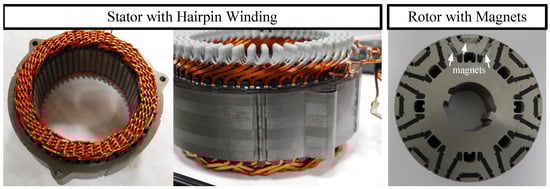 The traction machine is of the Interior Permanent Magnet Motor (IPMSM) type. The pictures of the machine are depicted in Figure 1. In contradiction to the previous transaxle versions, the hairpin winding was utilized for the first time in this model (see [6] for a comparison of different motor constructions from Toyota).