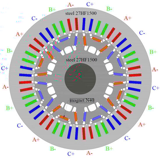 The machine geometry and the materials used are depicted in Figure 2. The main dimensions are summarized in Table 2. The machine has pole pairs. The stator has 48 rectangular slots, and the winding is a distributed winding type made of segmented rectangular rods of the hairpin type. The current direction in each coil side is depicted in Figure 2. Letters A, B, and C are phase names. ‘+’ means current flowing into the drawing plane. ‘−’ means current flowing out of the drawing plane.