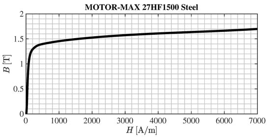 Both stator and rotor cores are made of steel sheets of 0.27 mm thickness. It was found out that the steel MOTOR-MAX 27HF1500 from Cleveland-Cliffs (Cleveland, OH, USA) was utilized in both stator and rotor [16]. The -curve of this steel is depicted in Figure 3. The detailed steel parameters in numerical form are supplied to the reader as the Supplementary Materials attached to this paper (File S1).